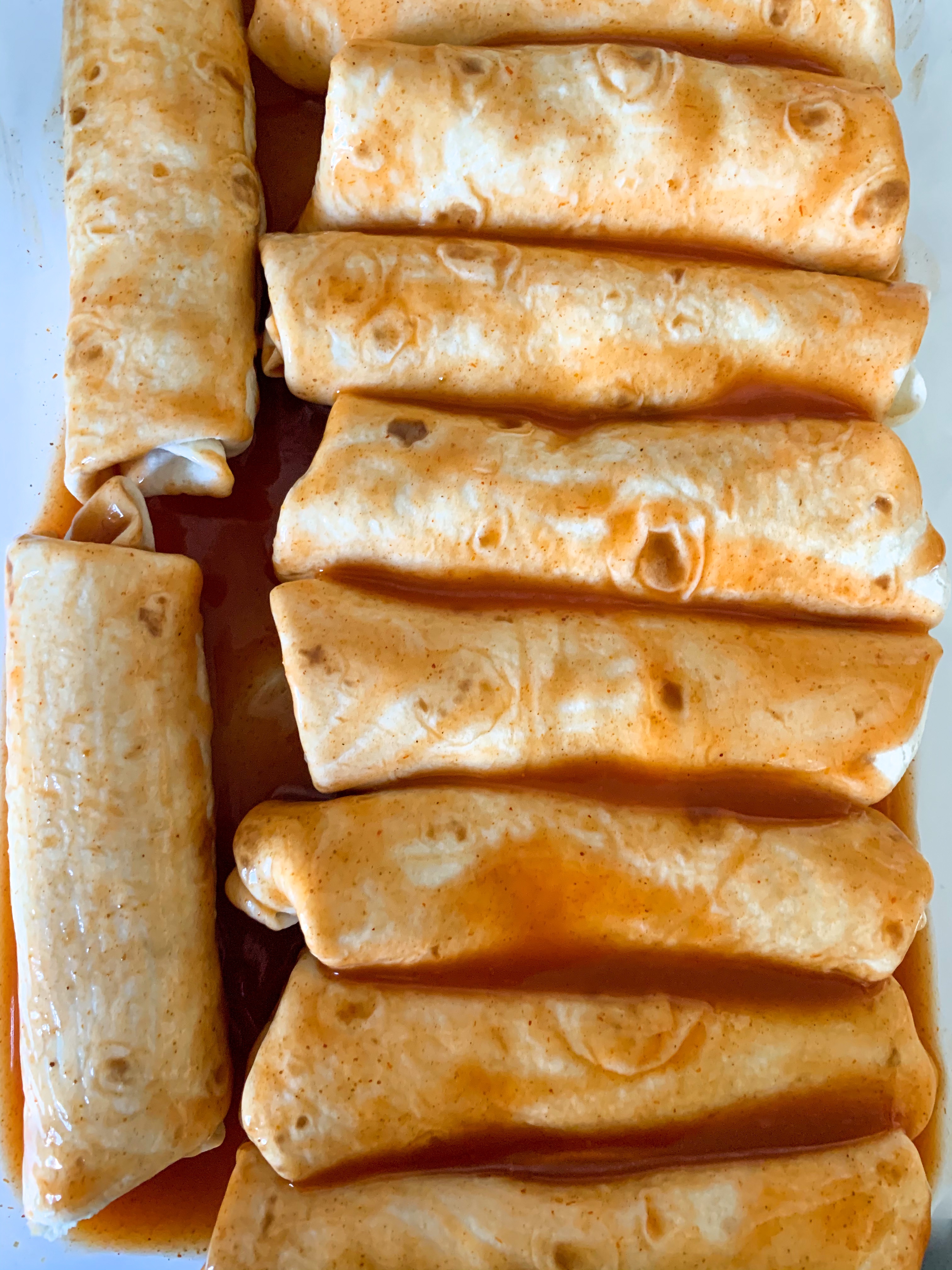 - In an 8×10-inch or 9×13-inch baking dish, pour half of the enchilada sauce and spread evenly on the bottom of the dish.