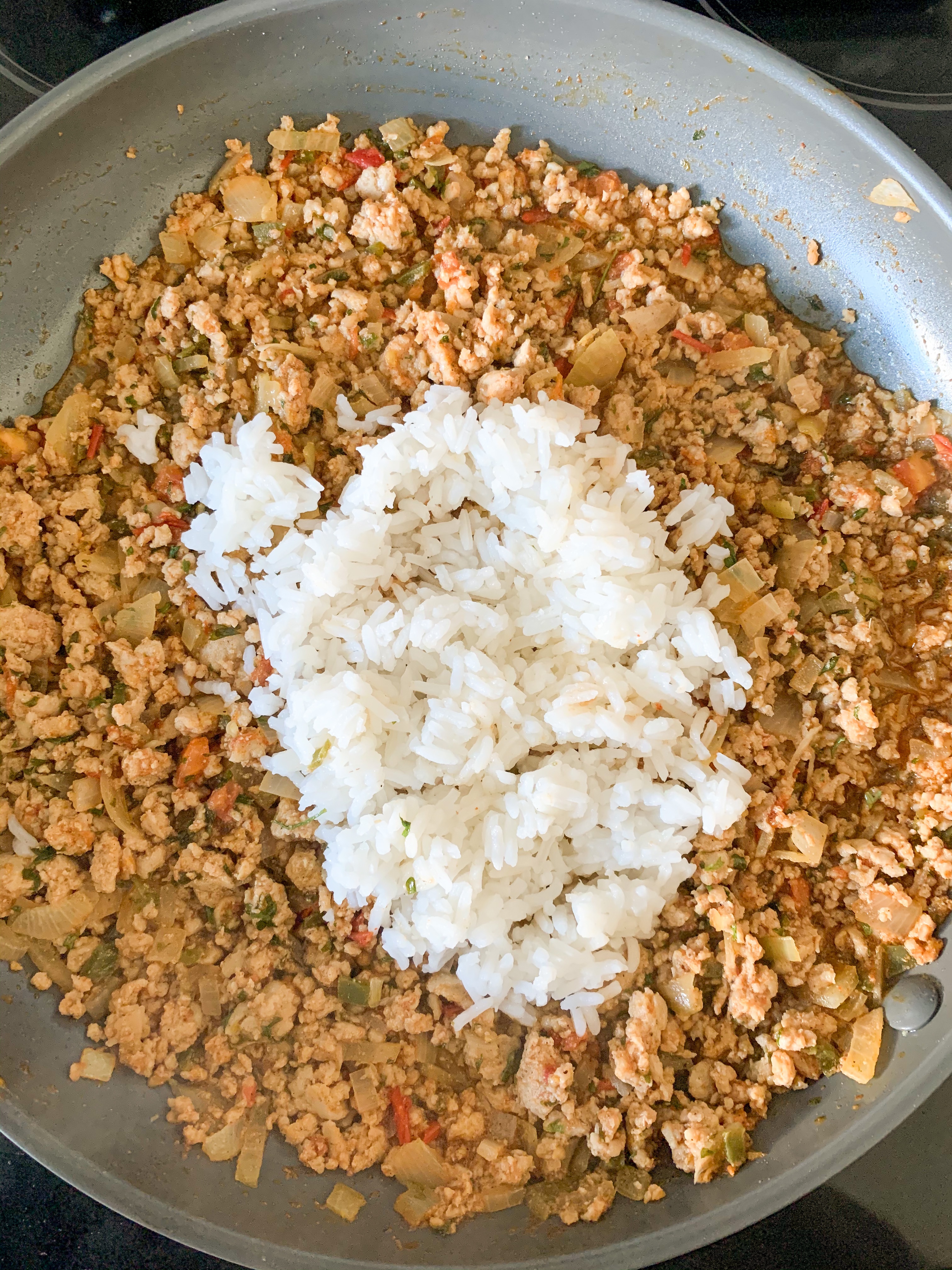 - To the chicken mixture, add cooked rice, cumin, parsley flakes, chili powder, salt and pepper. Mix well and cook chicken thoroughly, about 5-7 minutes.